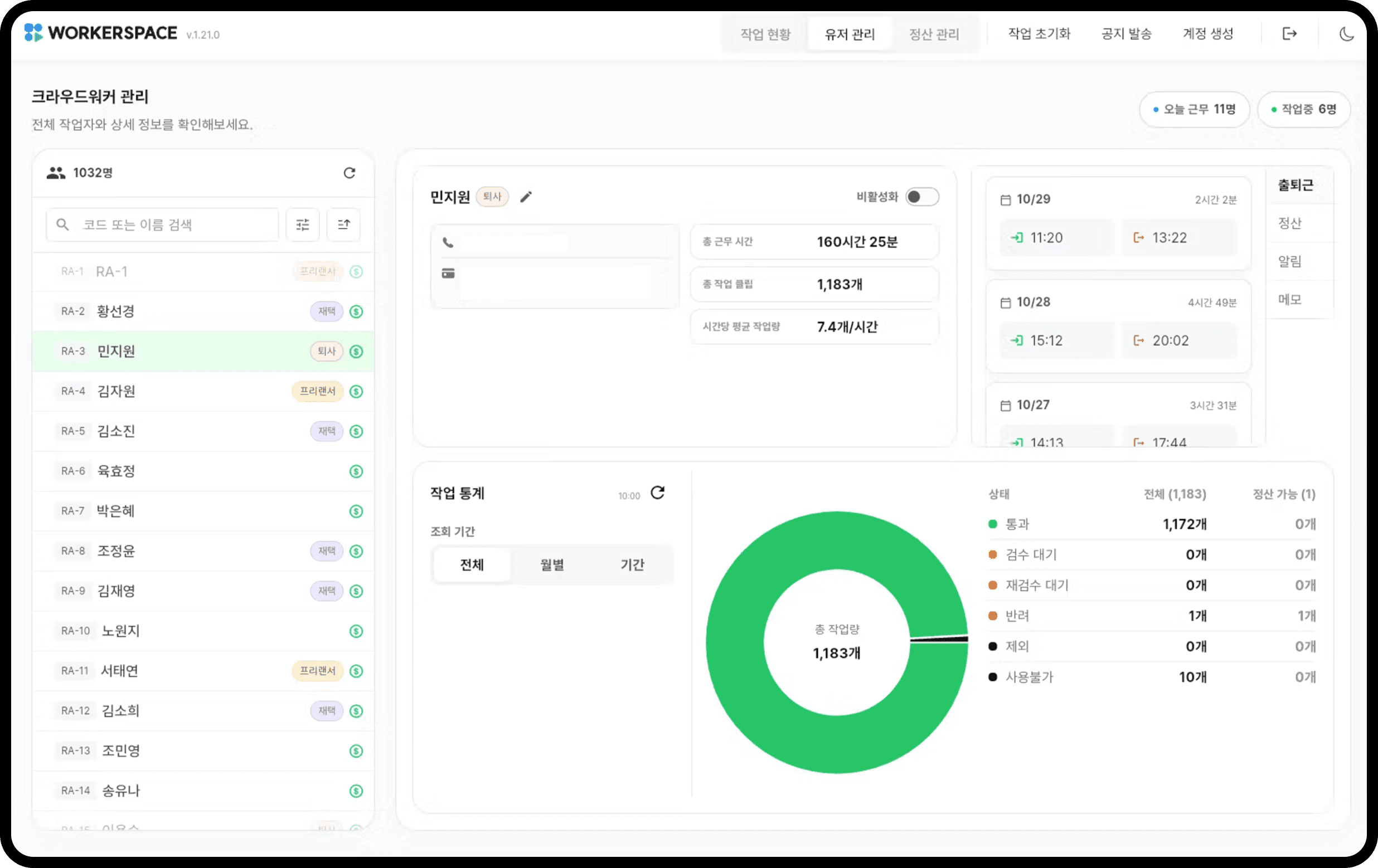 출퇴근 기록과 작업 이력이 함께 정리되어 개별 워커의 상태와 기여도를 빠르게 파악할 수 있습니다.