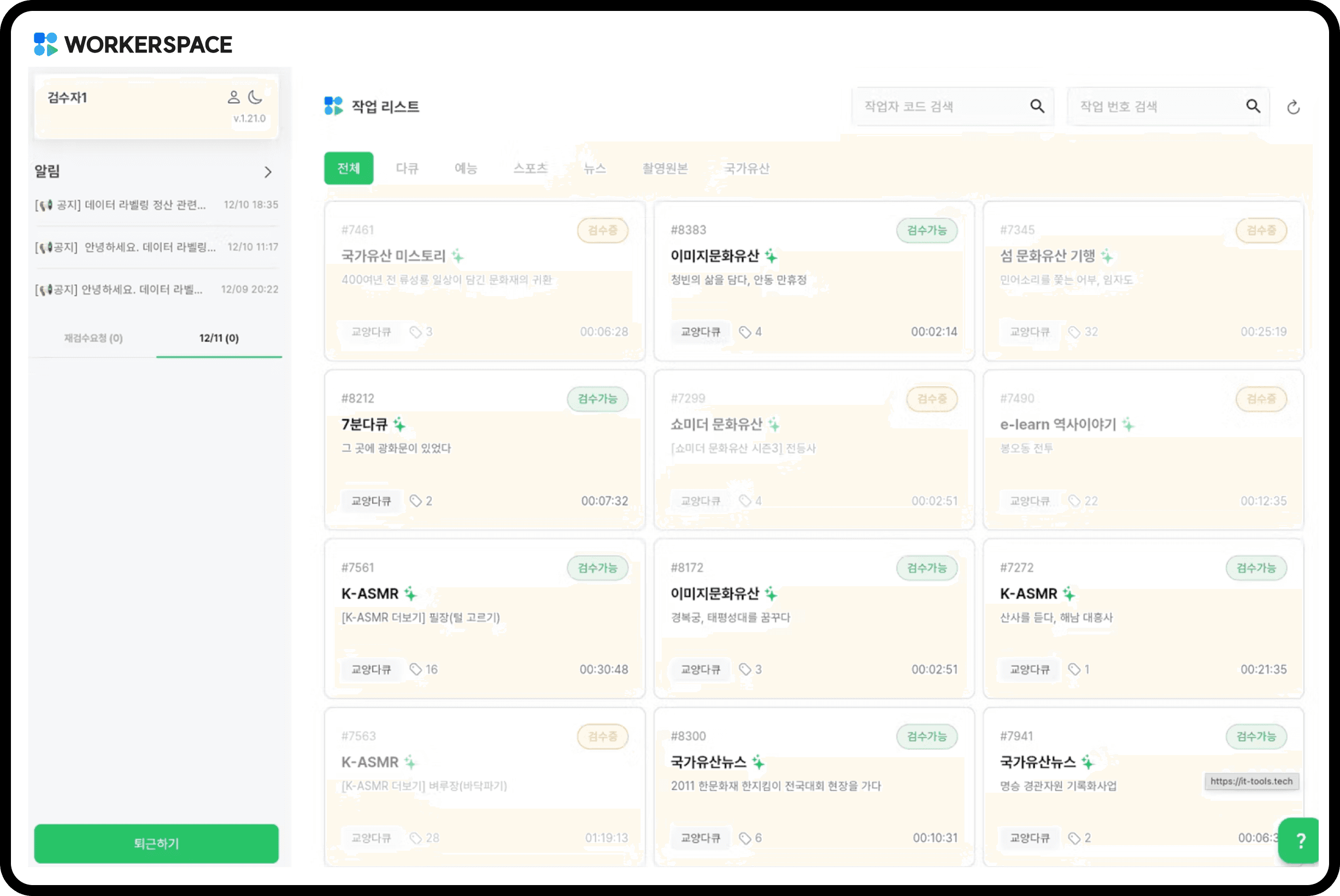 검수 가능, 검수 중 등 작업 상태를 카드 단위로 명확하게 표시합니다.