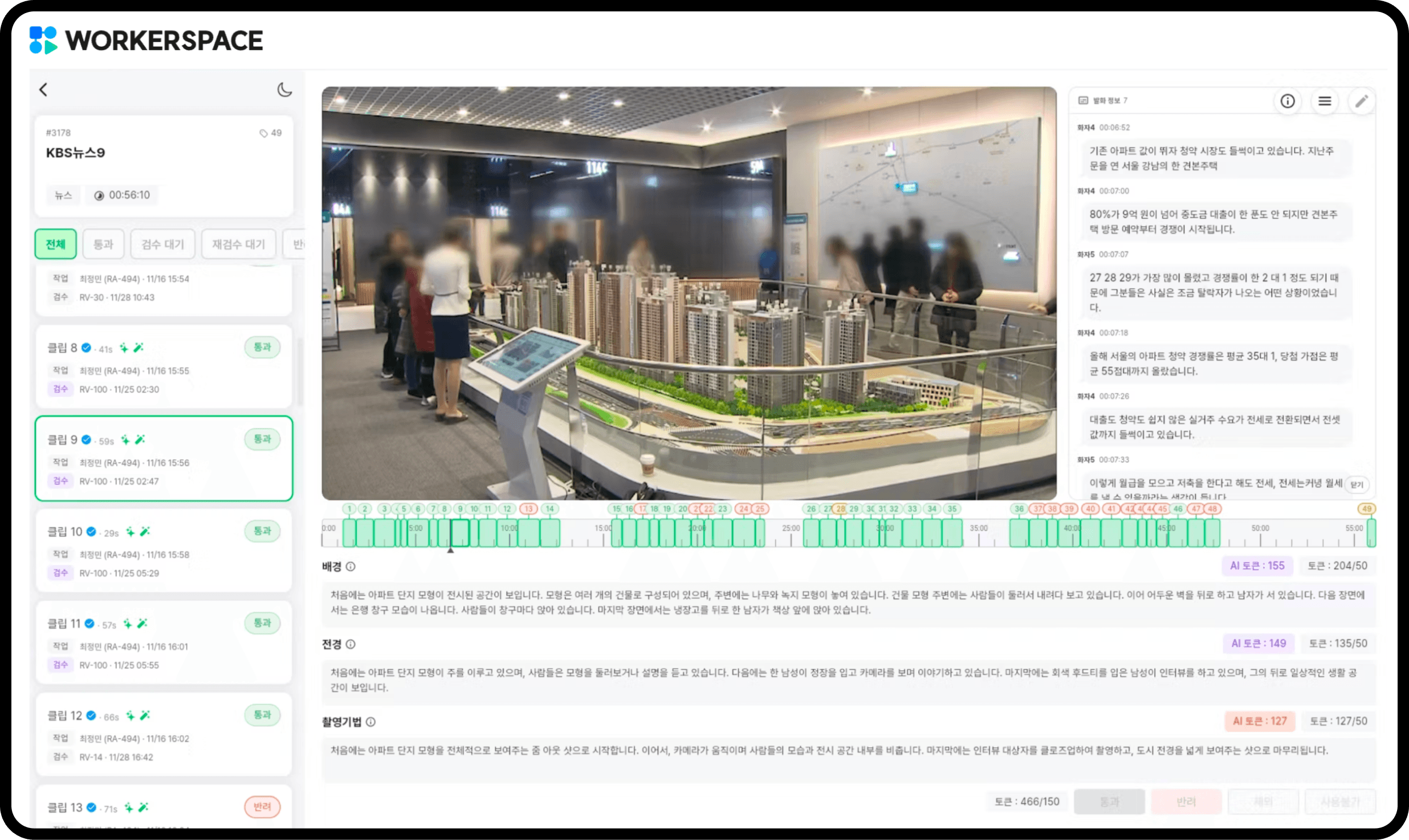 클립마다 주석, 요약, 검수 상태를 명확히 확인할 수 있어